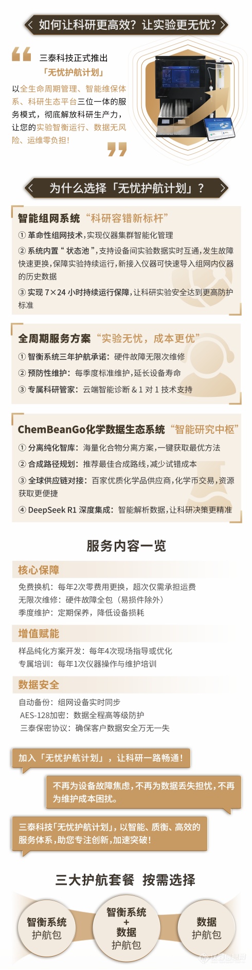 更惊喜的是,现在还可享受 “0 元” 用机福利 !若您暂时面临资金压力,却急需高效仪器提升实验效率,无需犹豫 —— 立即联系我司负责销售人员咨询详情、锁定名额,即可立即使用,无需支付设备费用,即可享智能过柱便捷!担心后续使用问题?三泰科技无忧服务保障计划为您兜底: